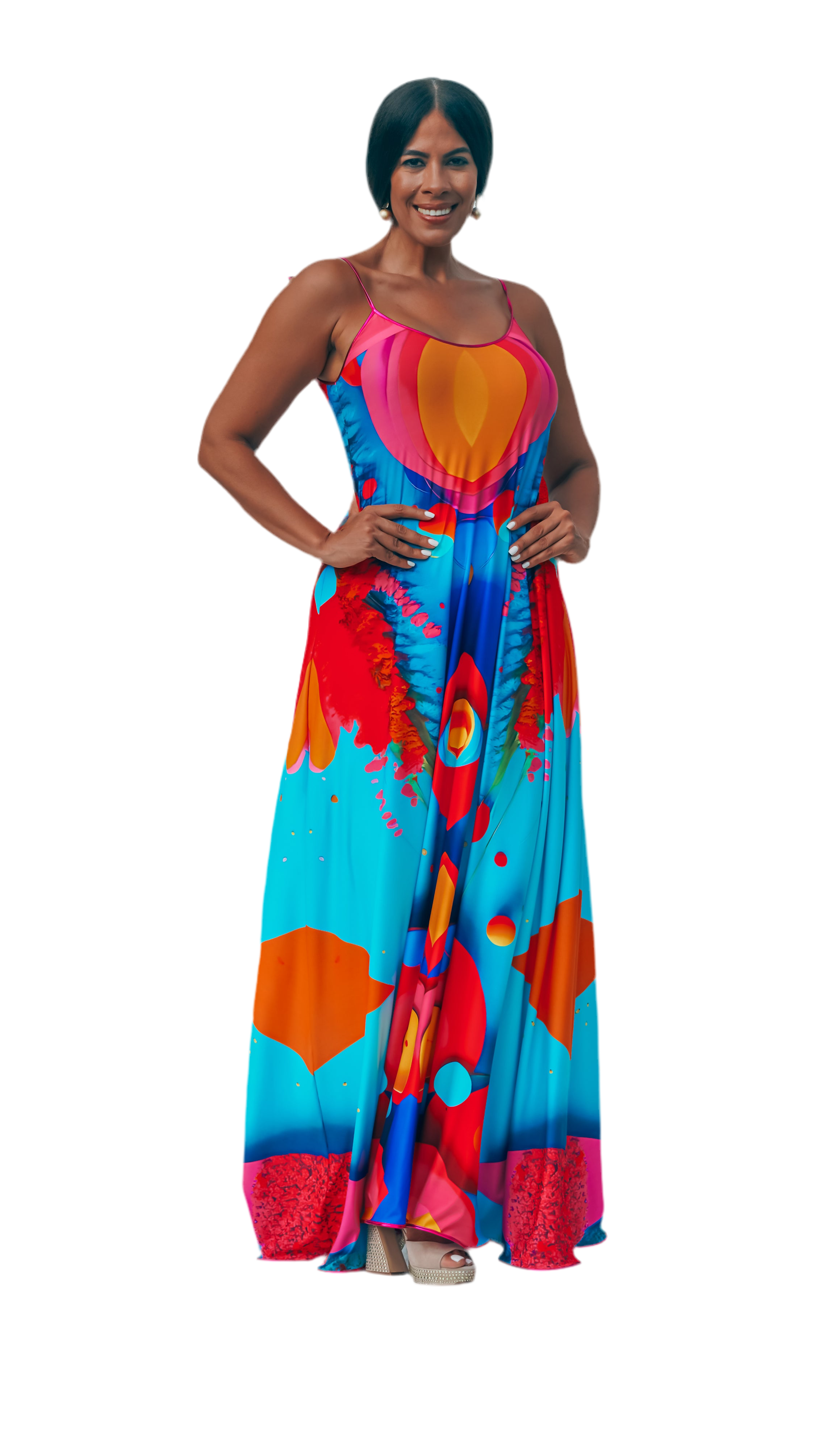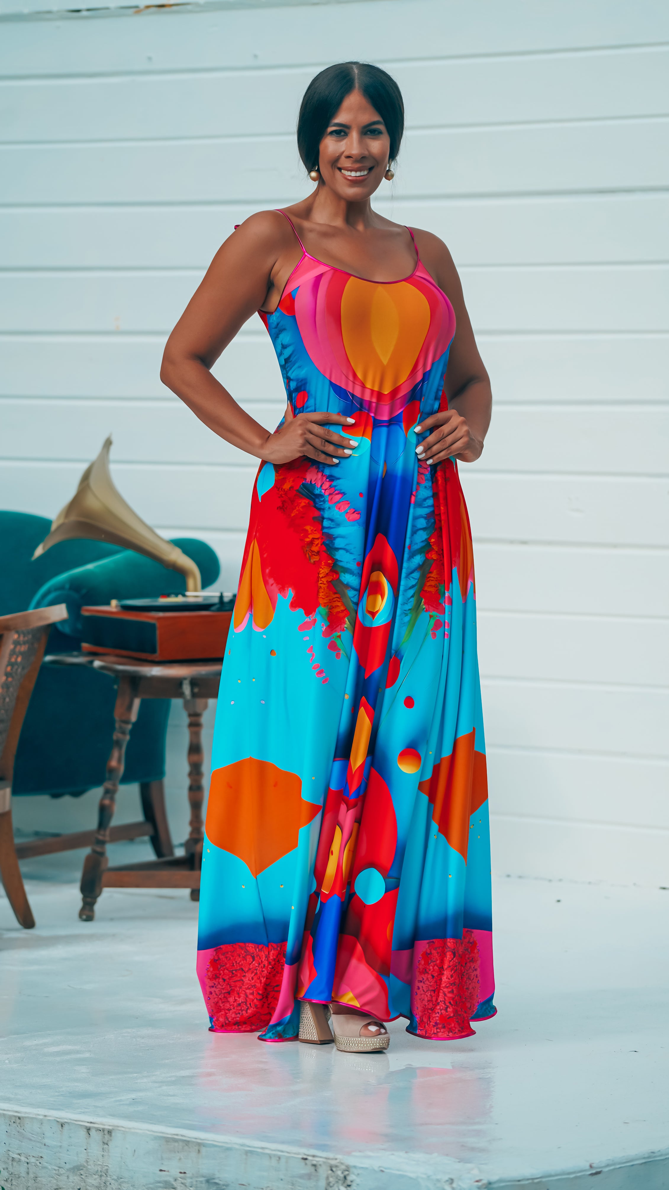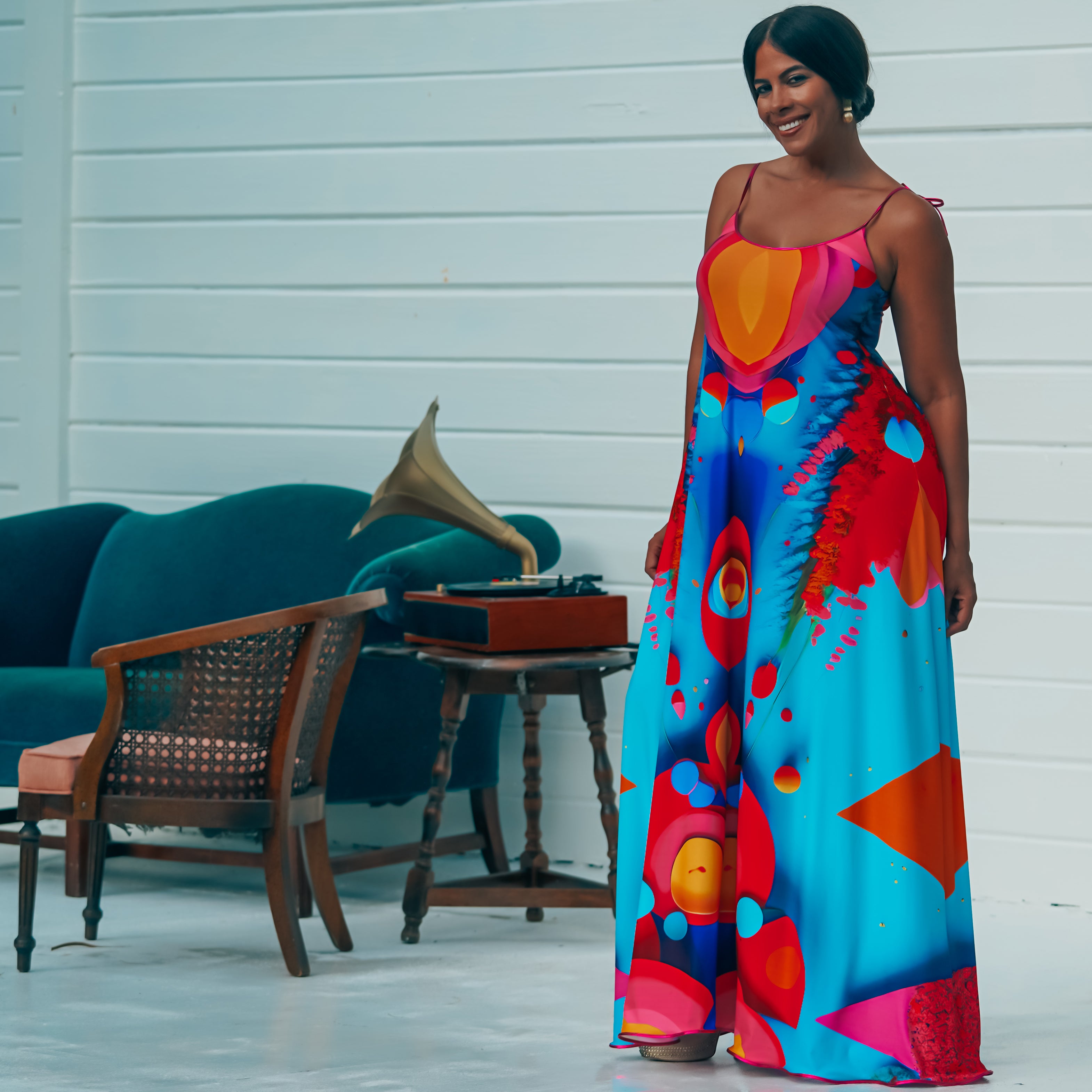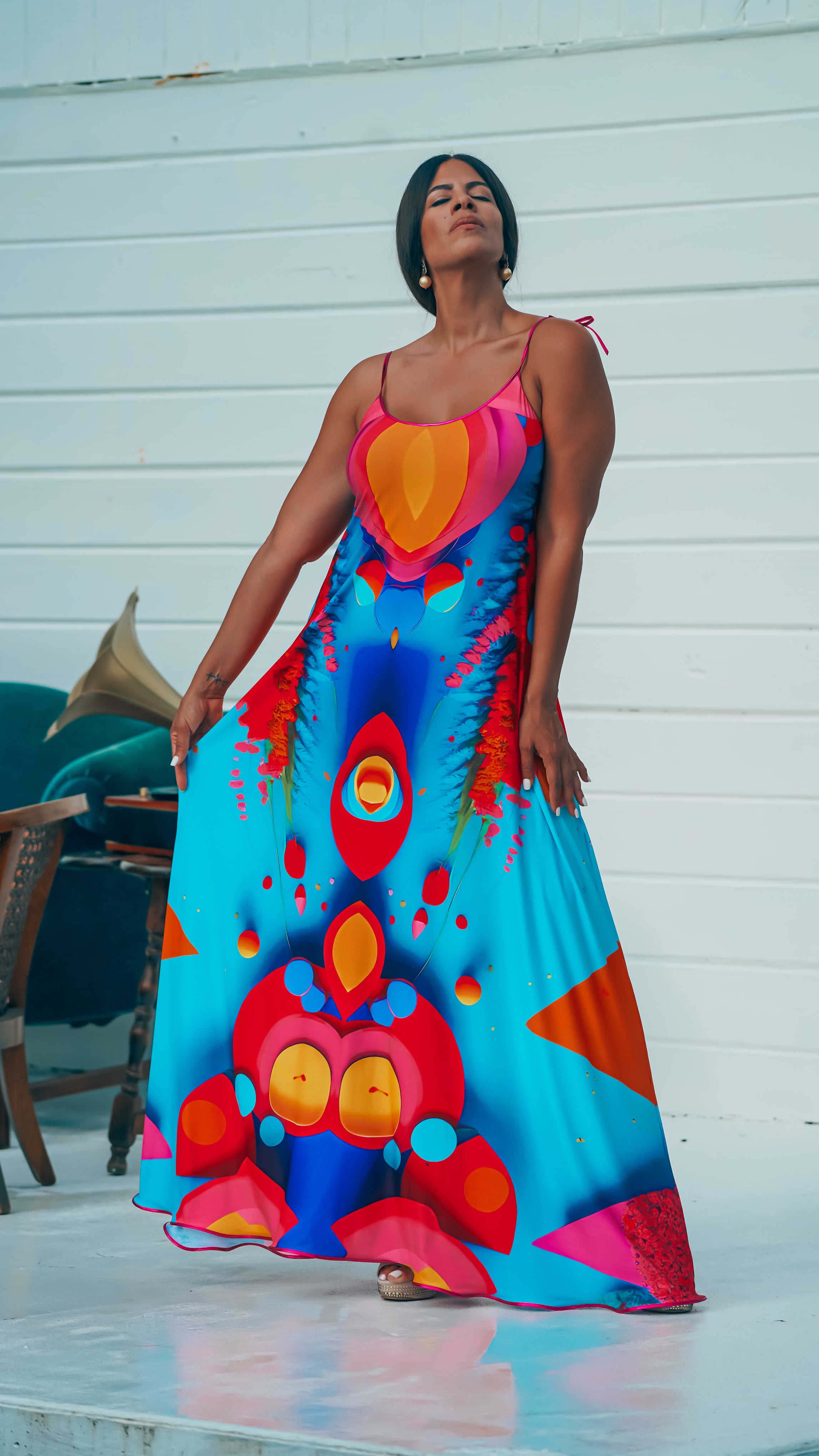 The Amelia Strappy Maxi in Carnaval print features adjustable straps, a gorgeous neckline, and a dazzling, vibrant colors of carnaval to create an elegant and refined look.