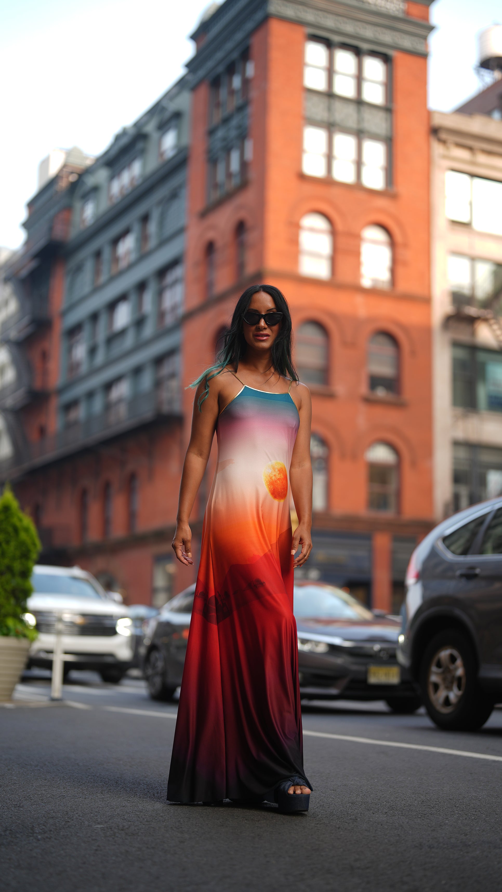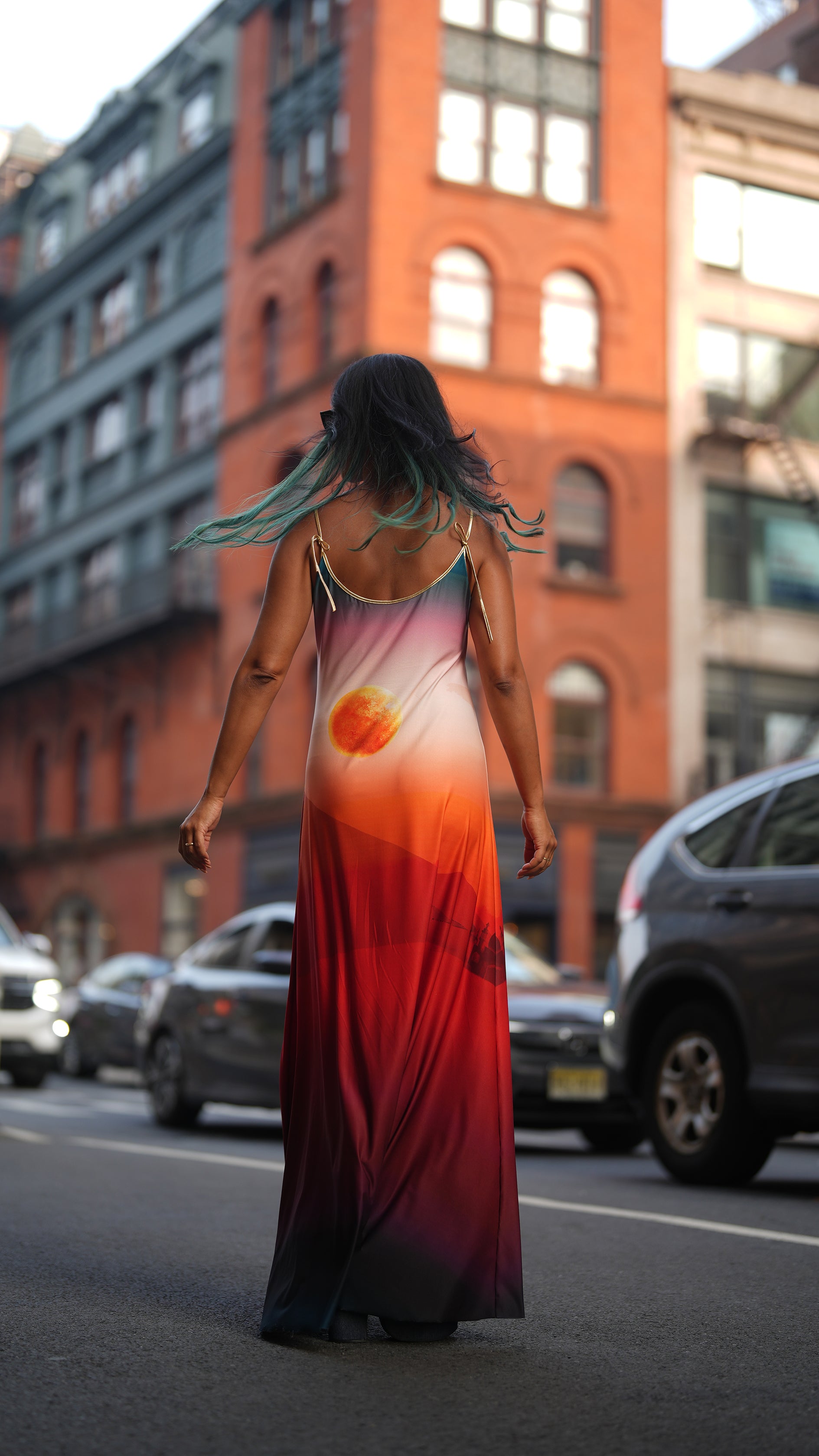The Misty Maxi in Sahara print features straps and a lower back cut with a flattering A-Line silhouette.