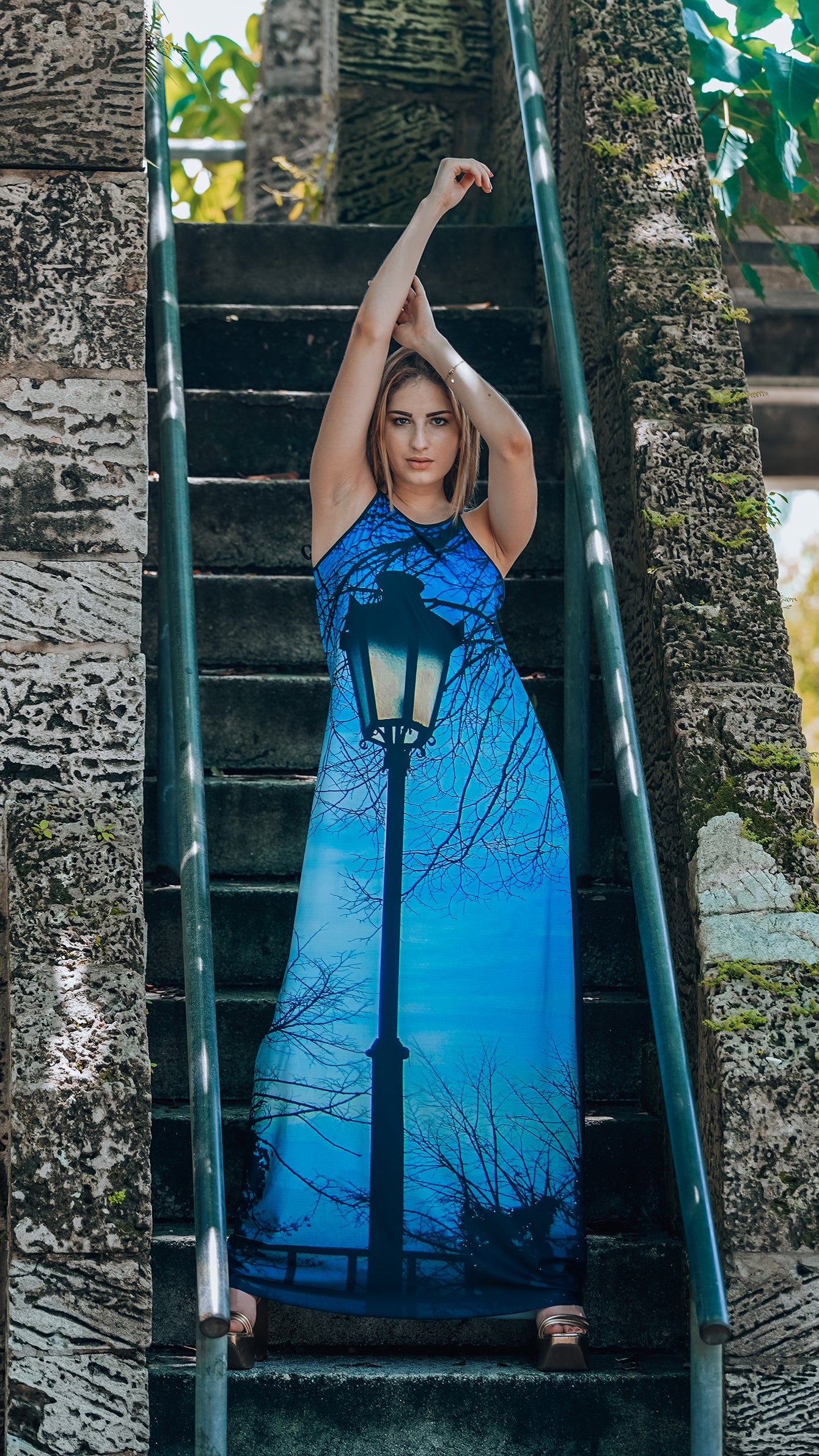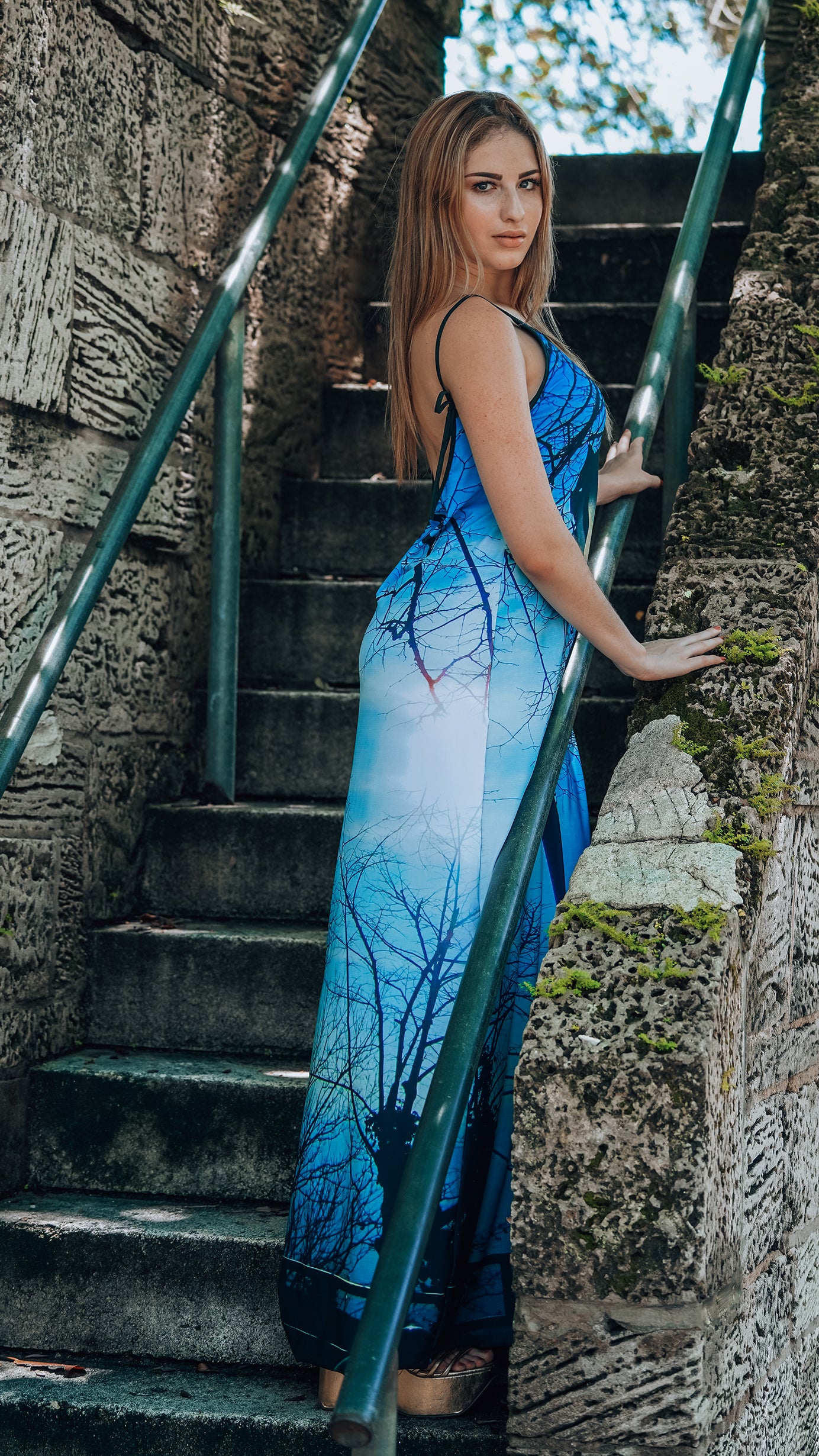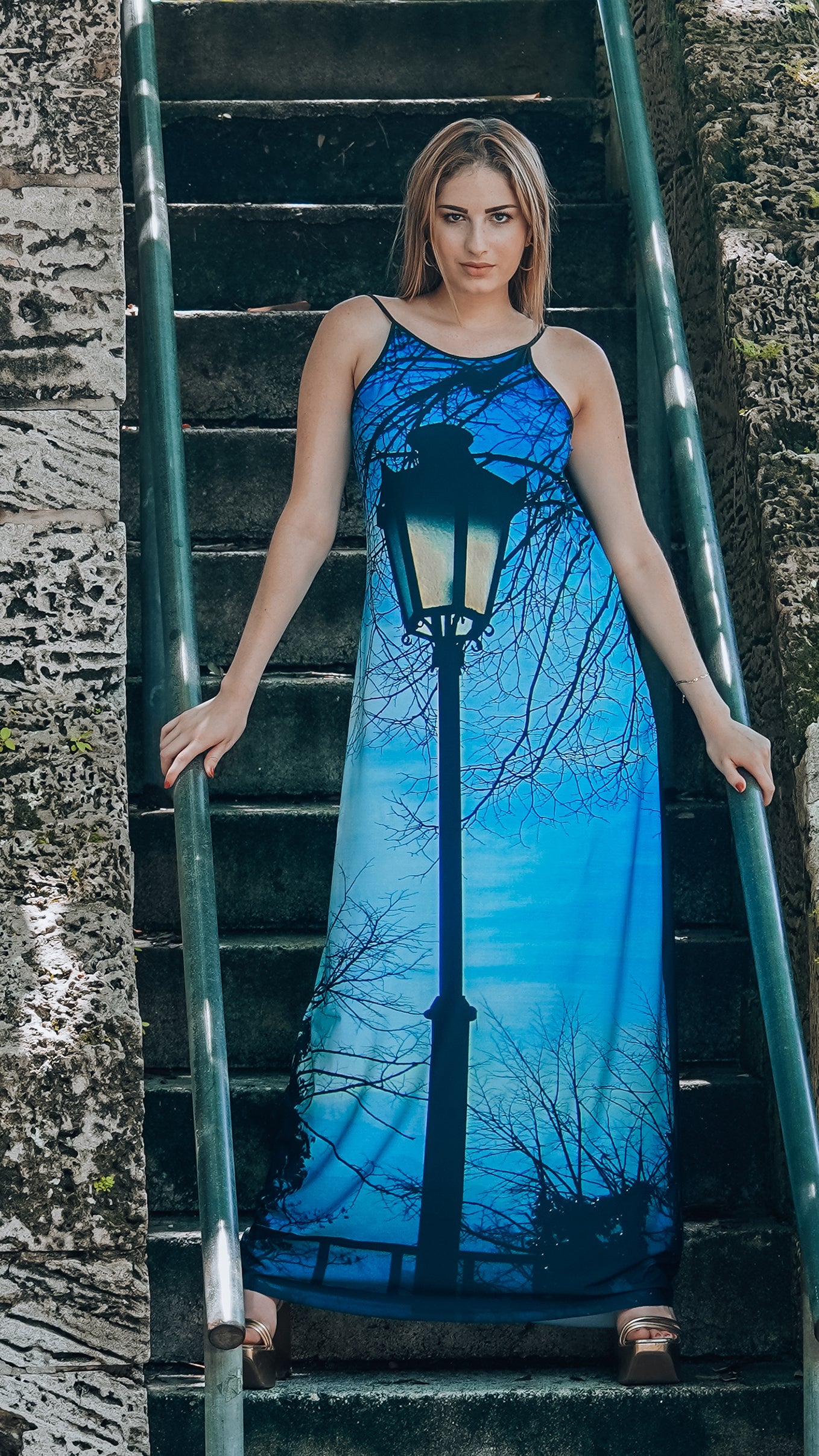 The Misty Maxi in Farol print features straps and a lower back cut with a flattering A-Line silhouette.