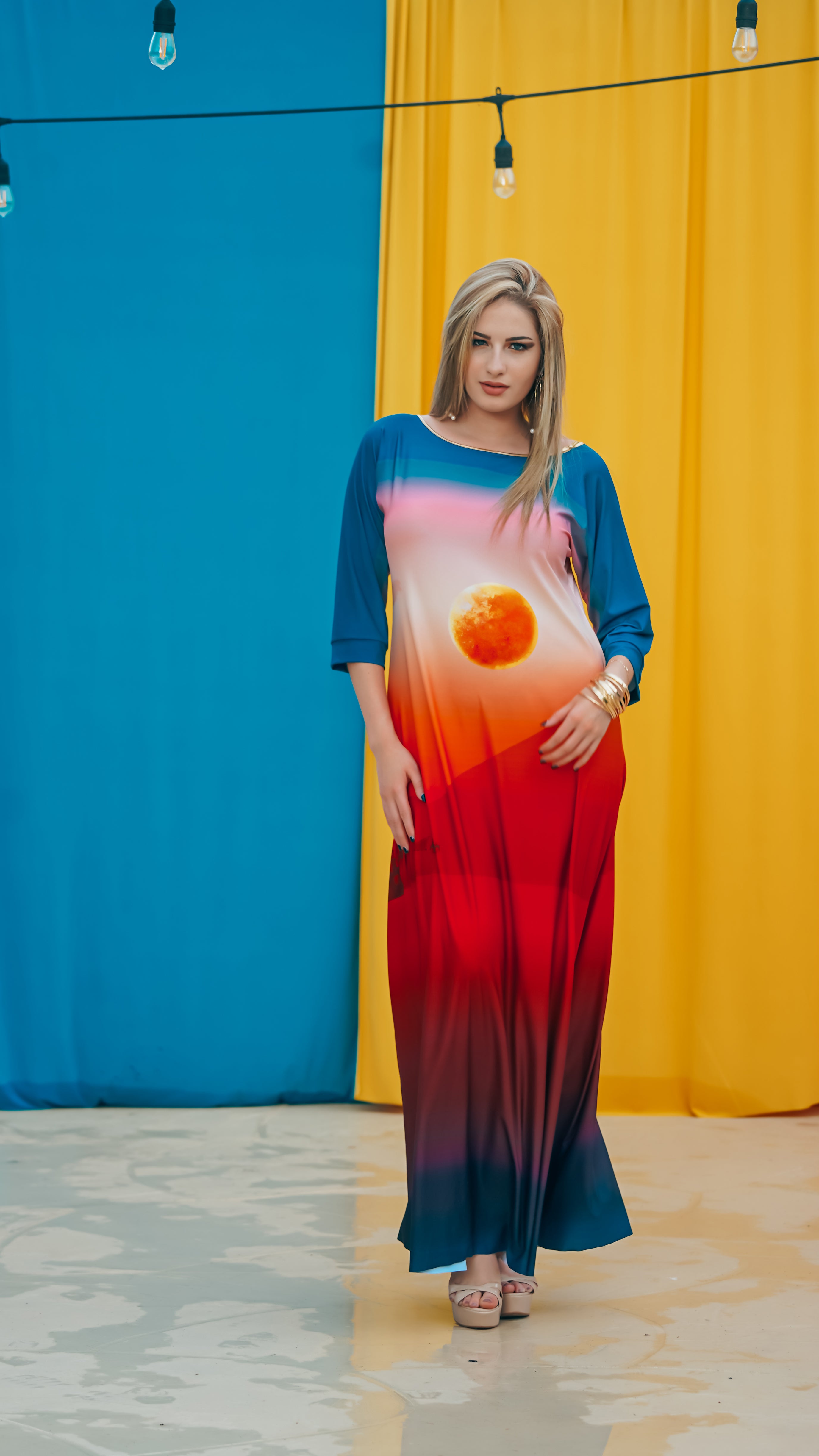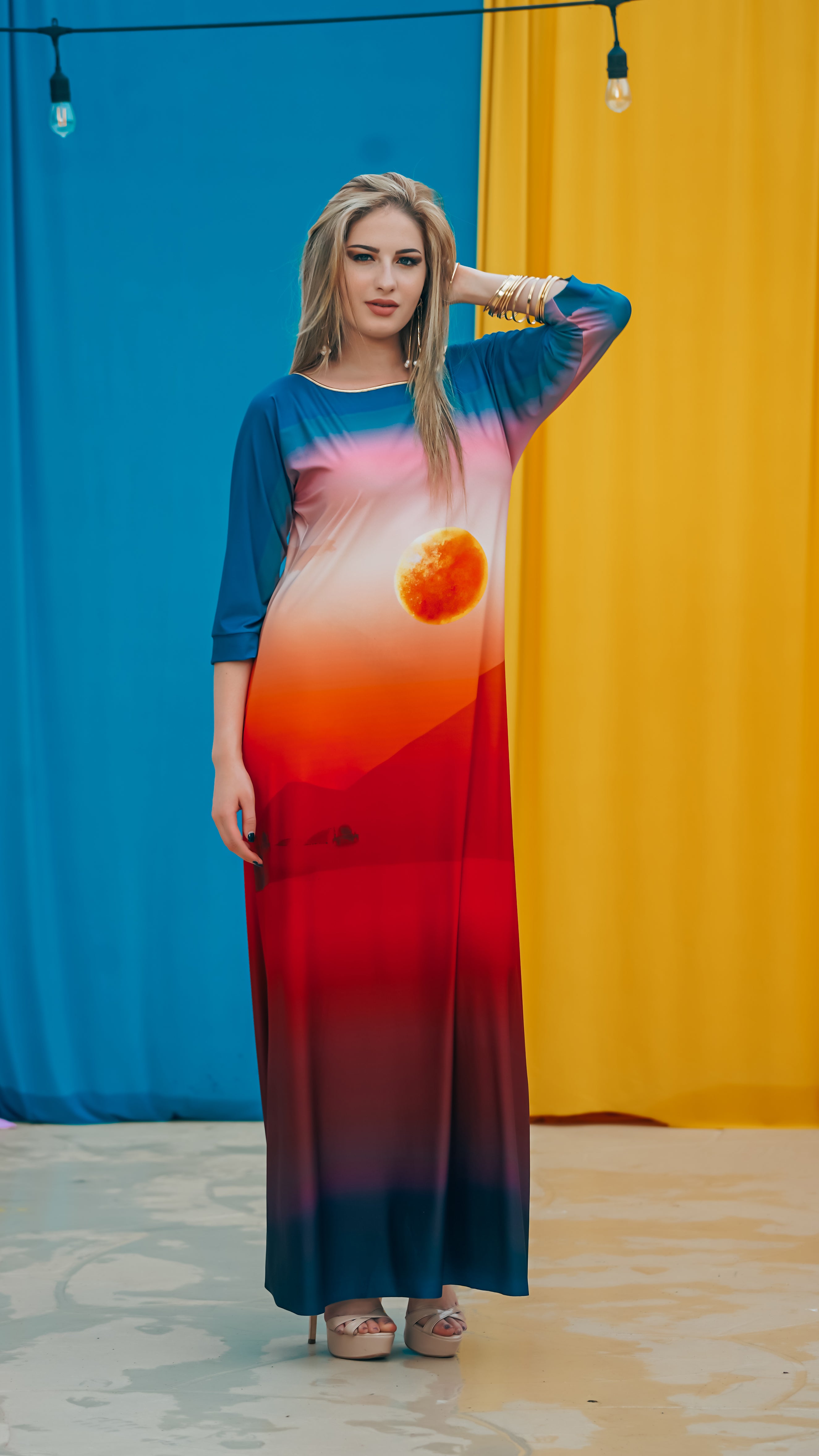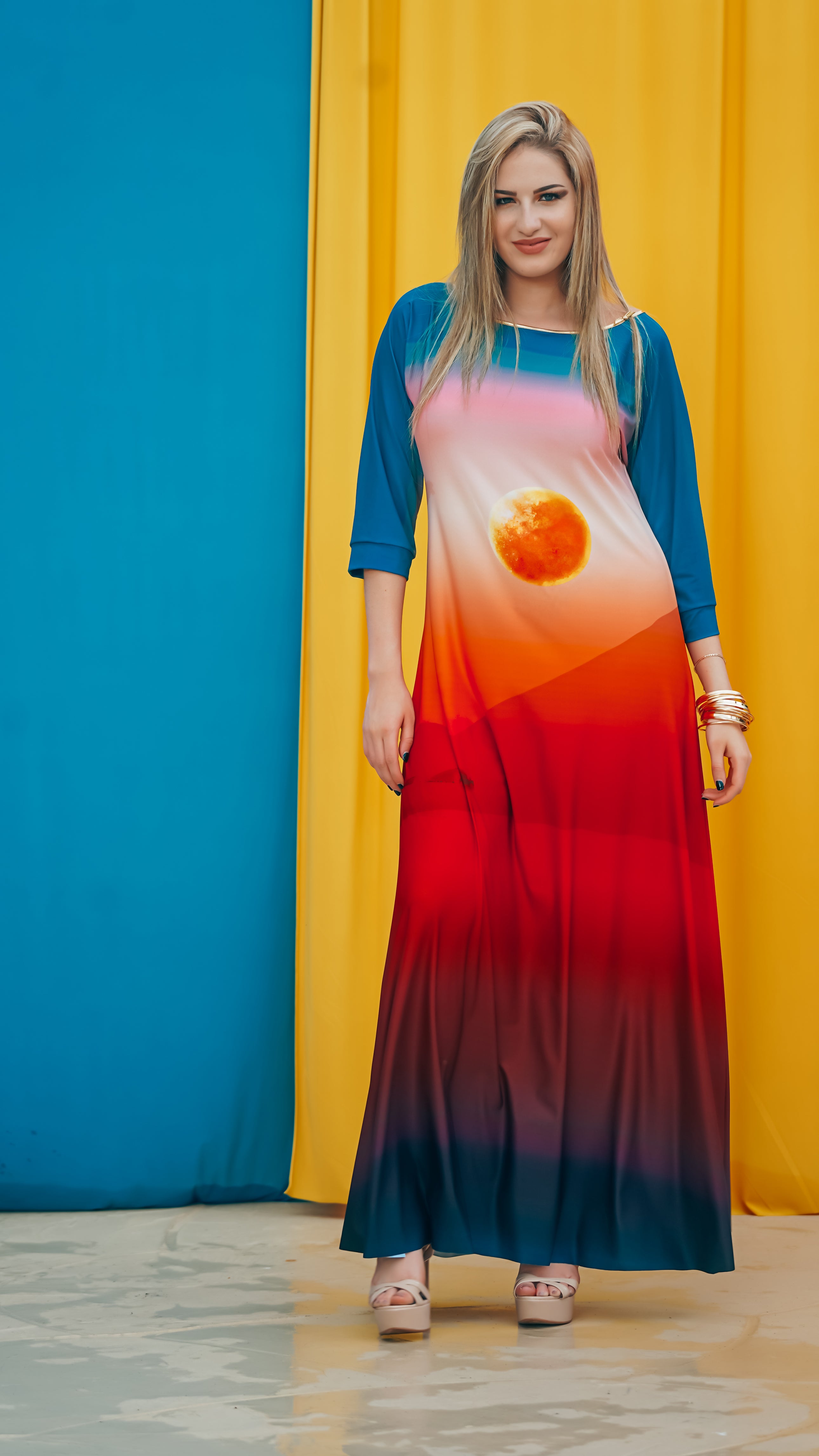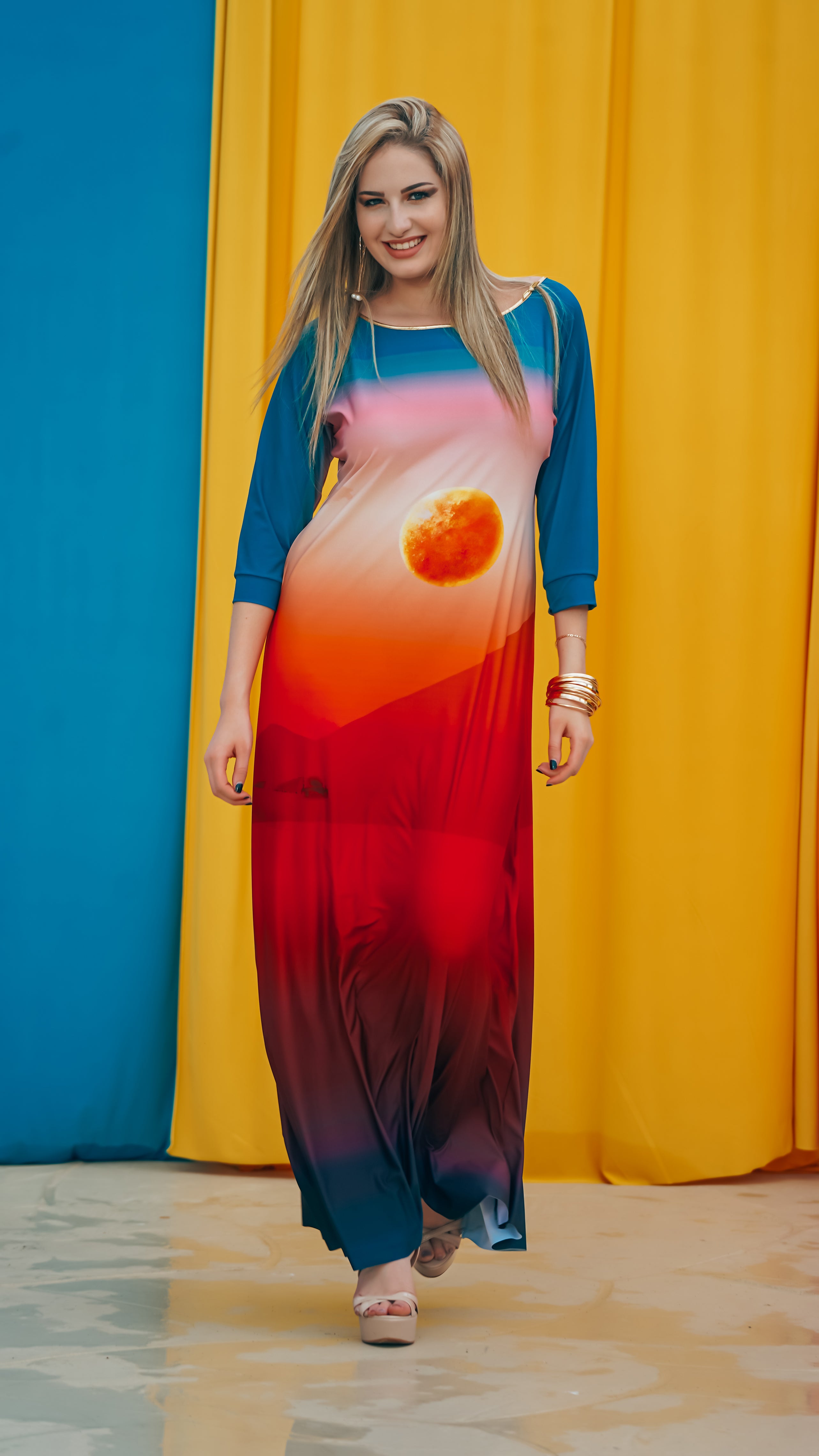The Omtara Maxi in Sahara print features a minimalist boatneck, flowing long sleeves and a flattering A-Line silhouette.