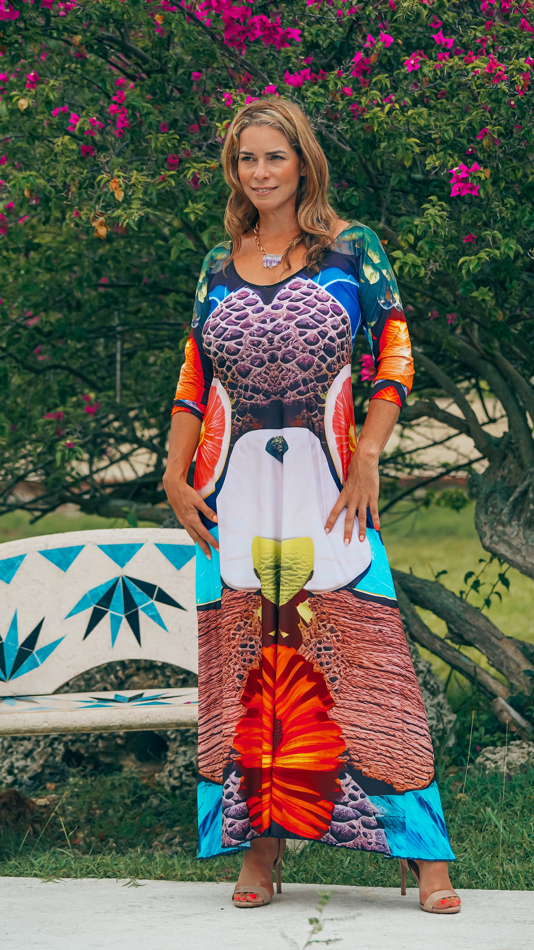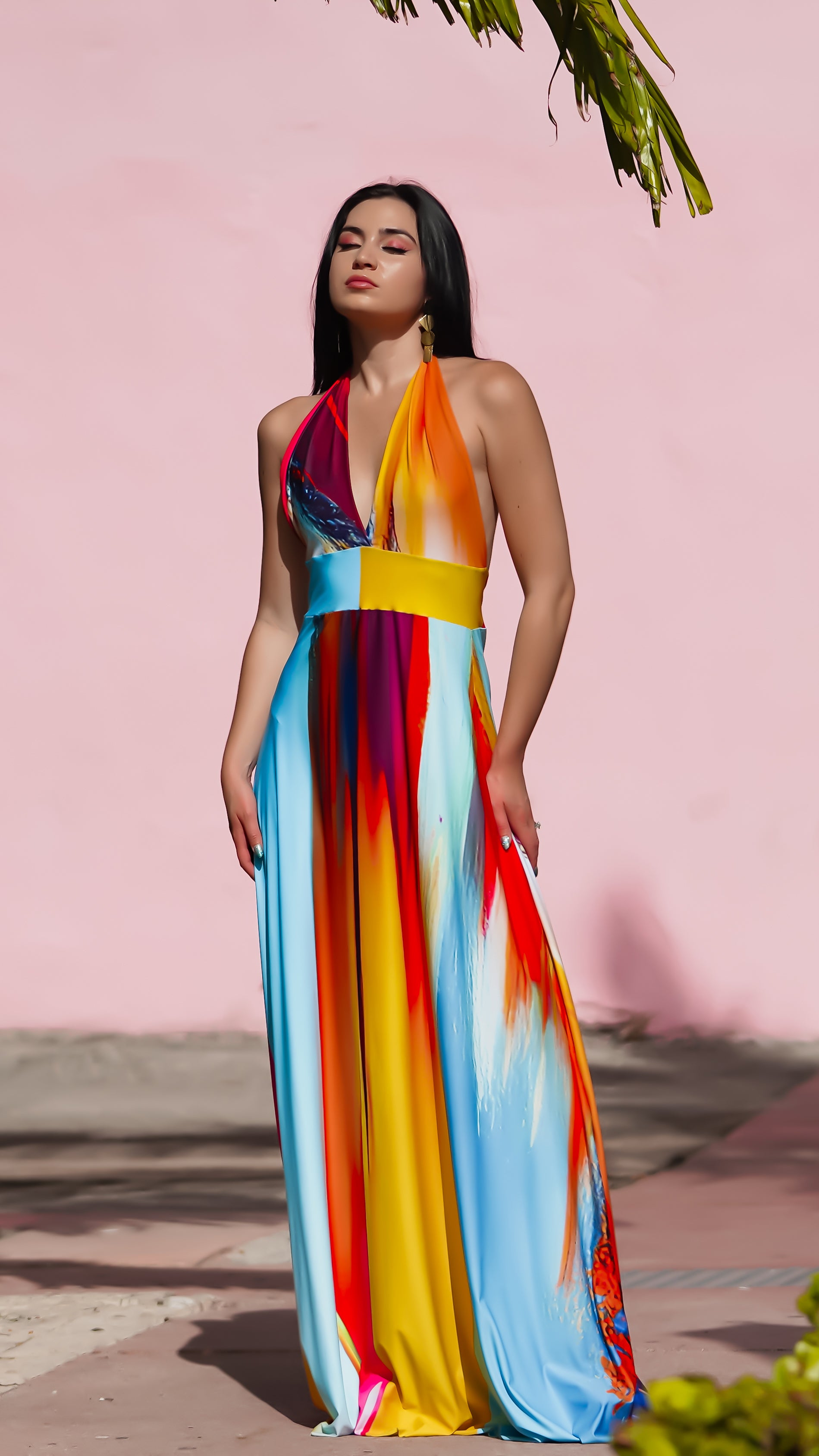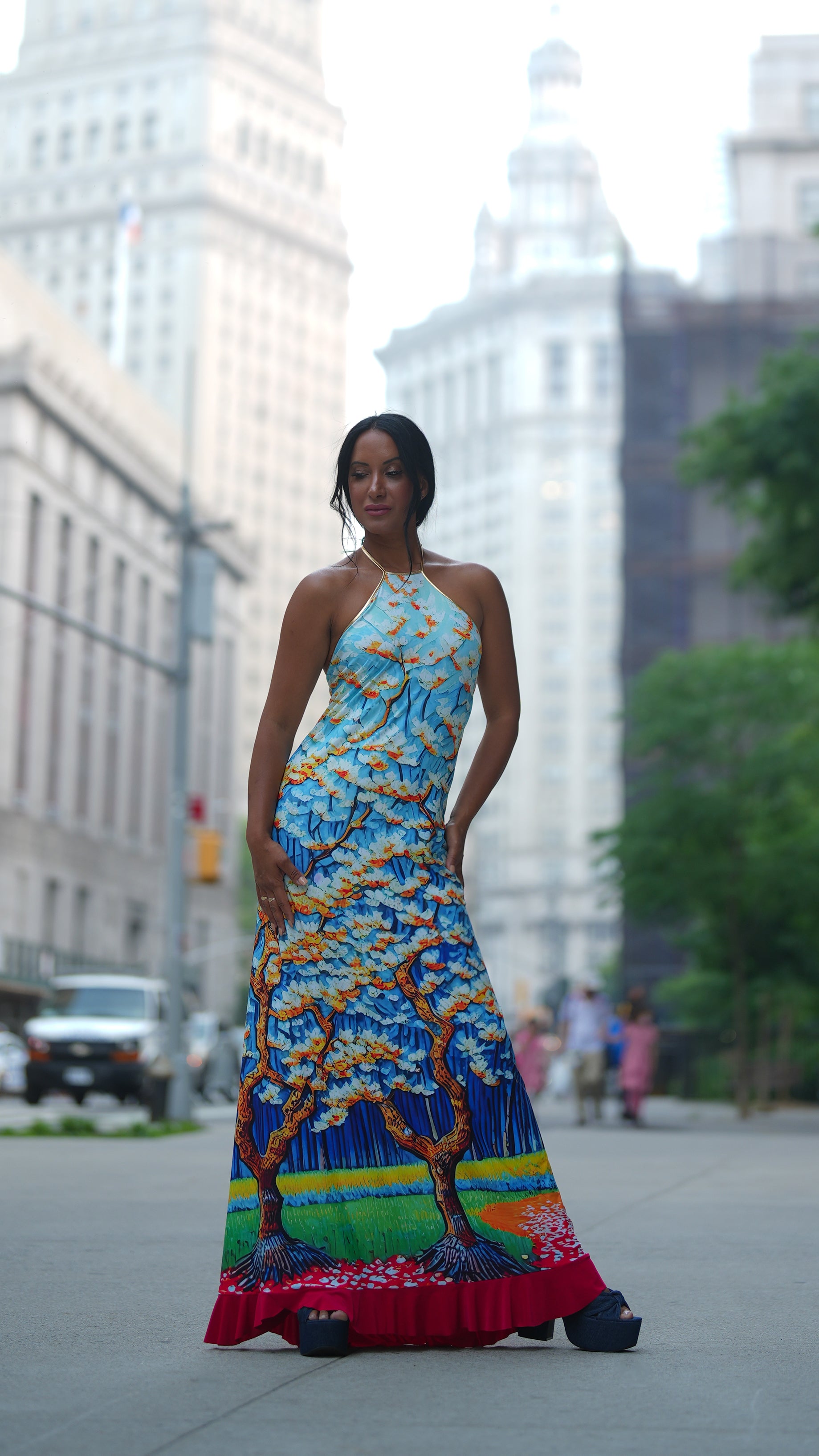 The Zola Maxi in Hawaii print features a halter-neck with a lower back cut with a flattering A-Line silhouette.