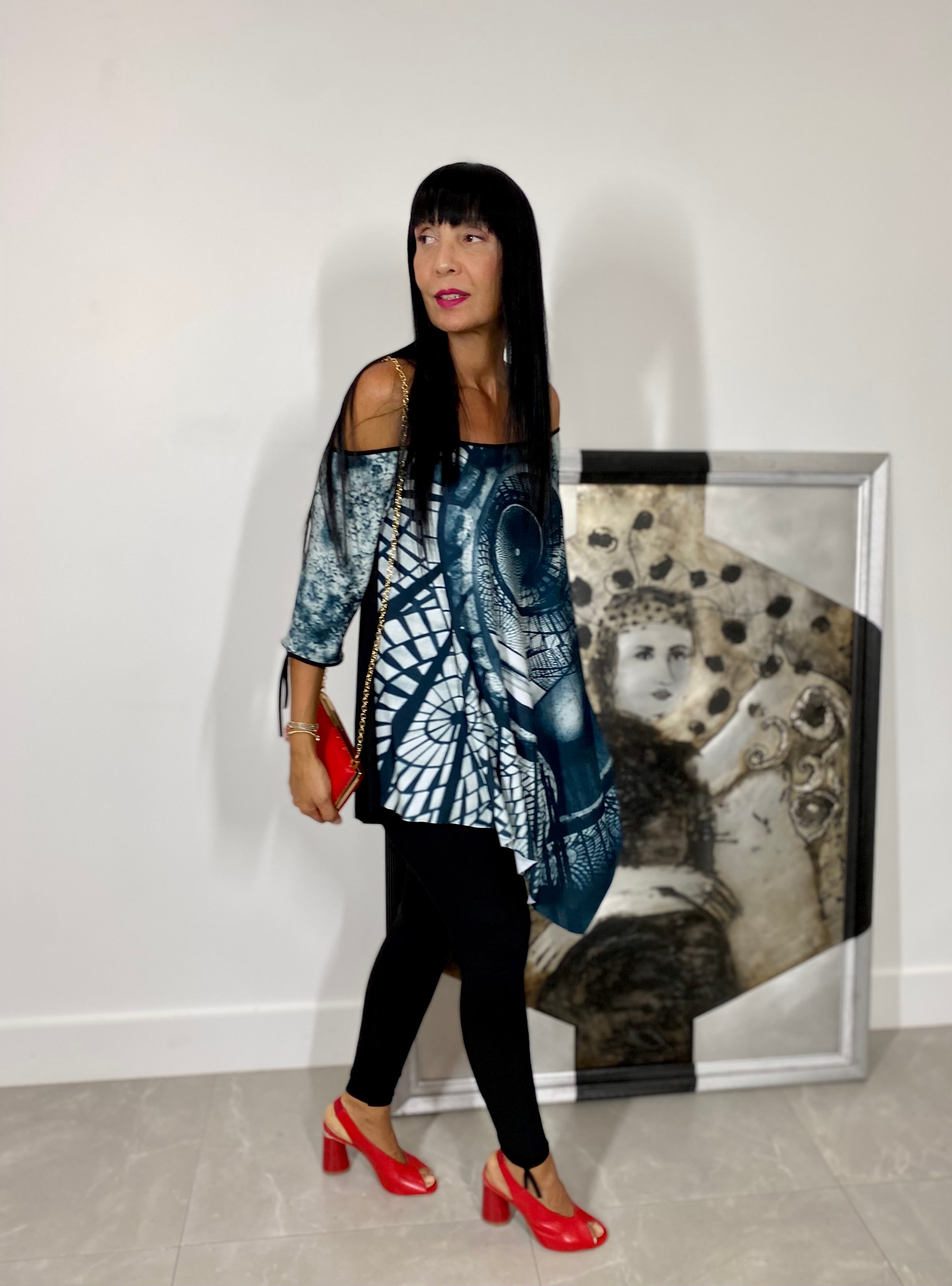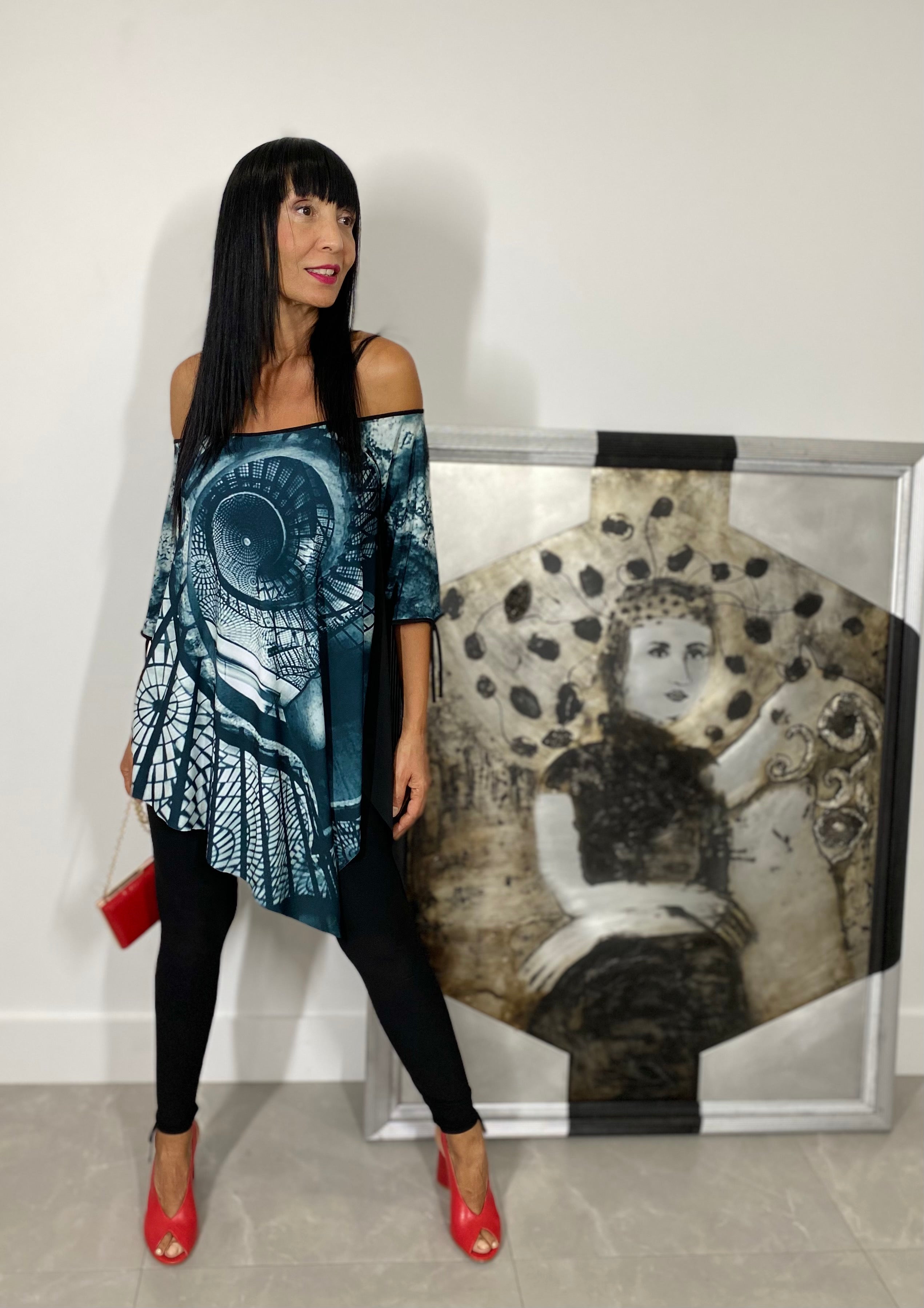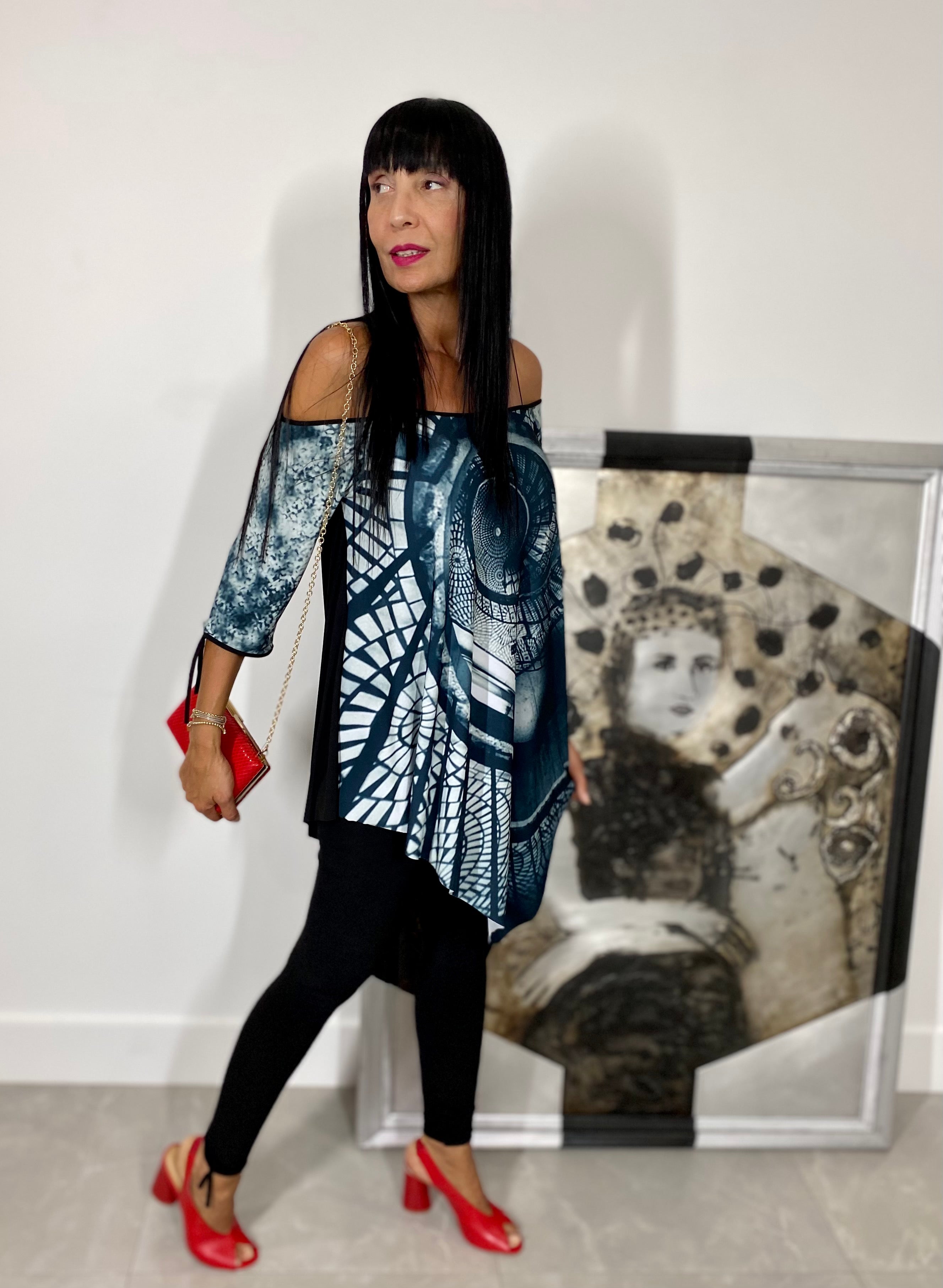 This one-of-a-kind tunic features an irregular hem, off shoulder look and an enchanting print. Will pair well with our leggings for a sophisticated modern look.