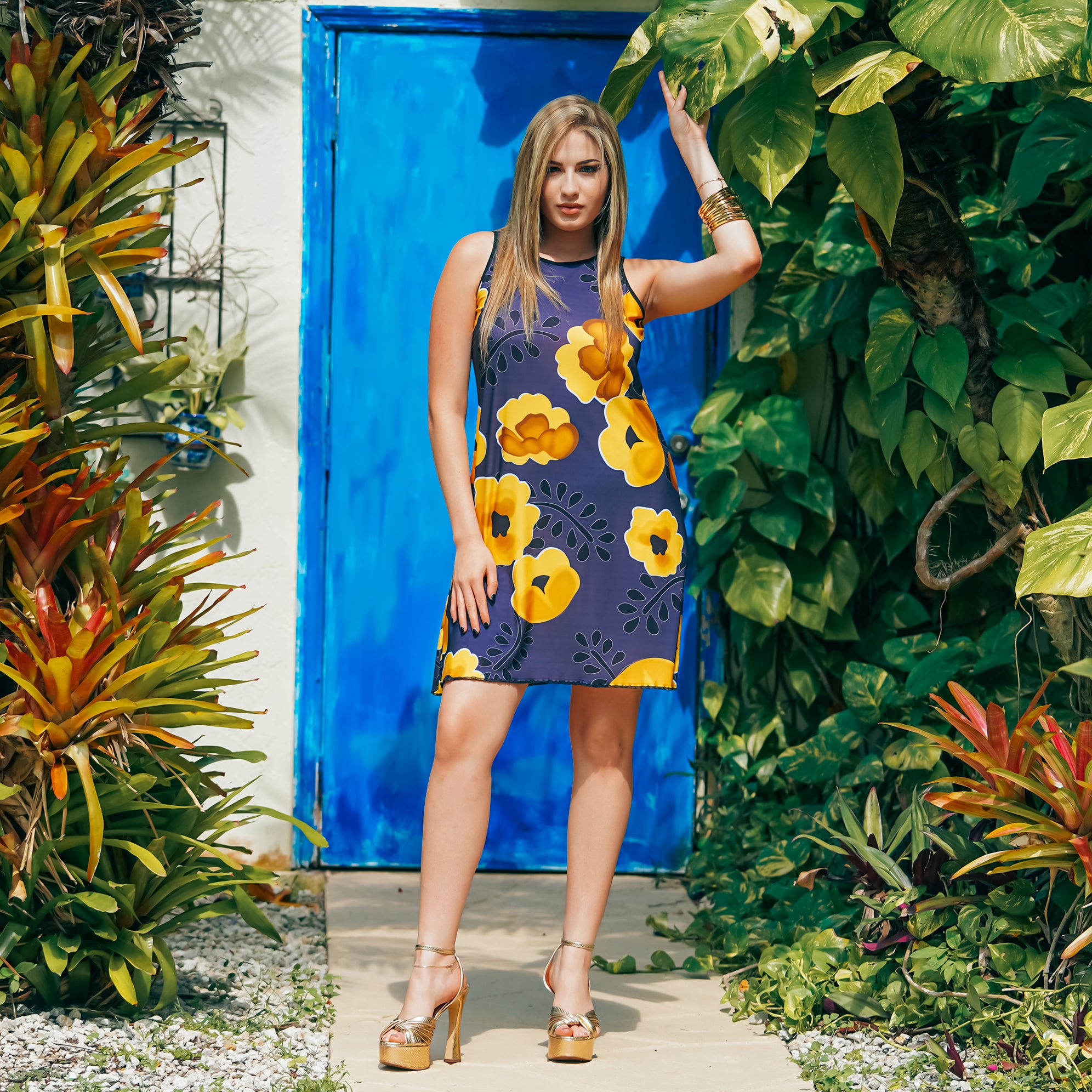 The Aurora Short Dress in Yellow Blooms features a flattering A Line silhouette, and can be dressed up or down for a ready-to-wear look that meets any occasion.
